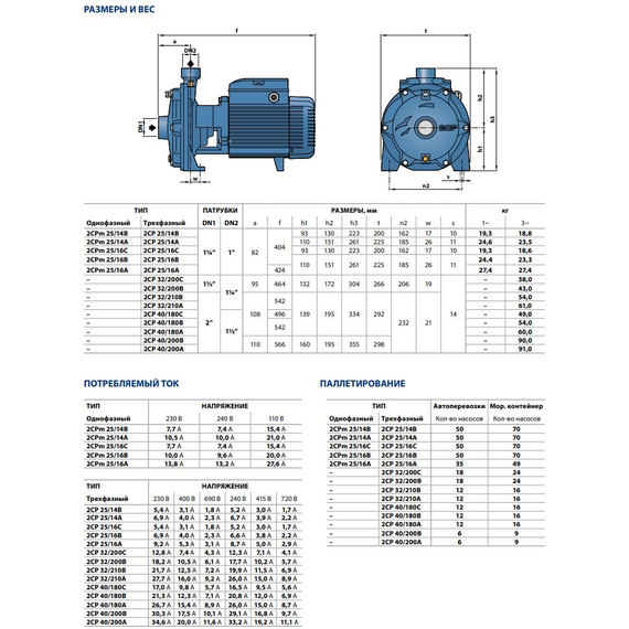 Центробежный насос с двумя рабочими колесами Pedrollo 2CP40/200A 11 kW